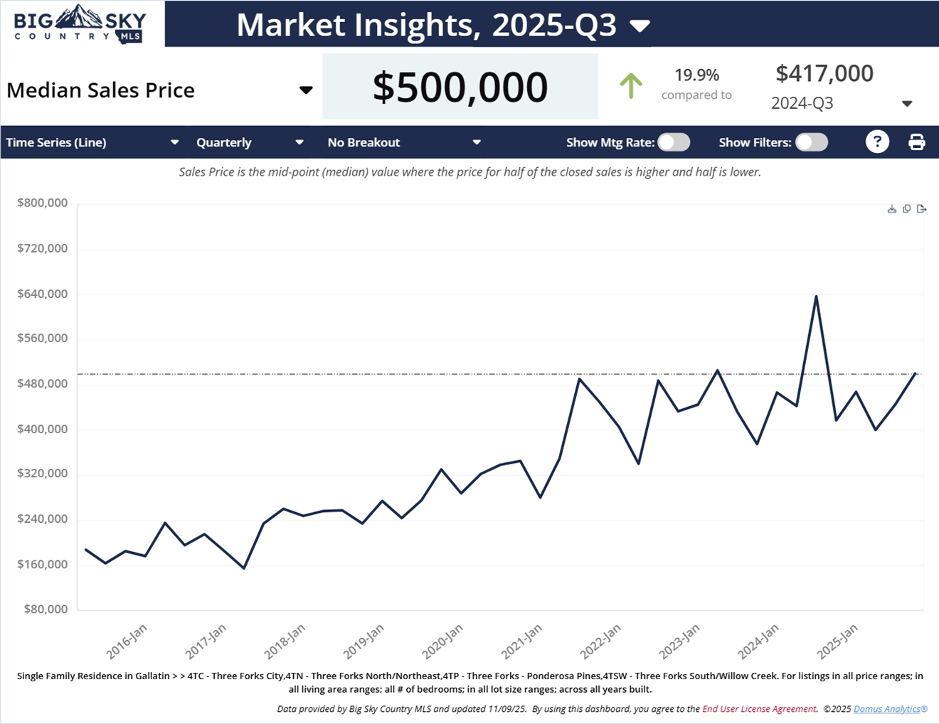 Chart 1: Into Q4, 2025: The median price for homes in Three Forks, MT is $500,000 (most recent Q3 data), which is ⇑ $100,000 or ⇑ 20% more than last quarter’s (Q2 2025) price of $400,000.